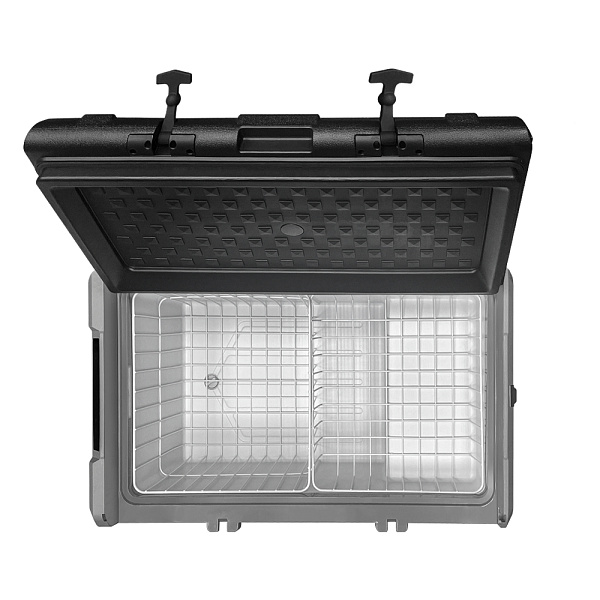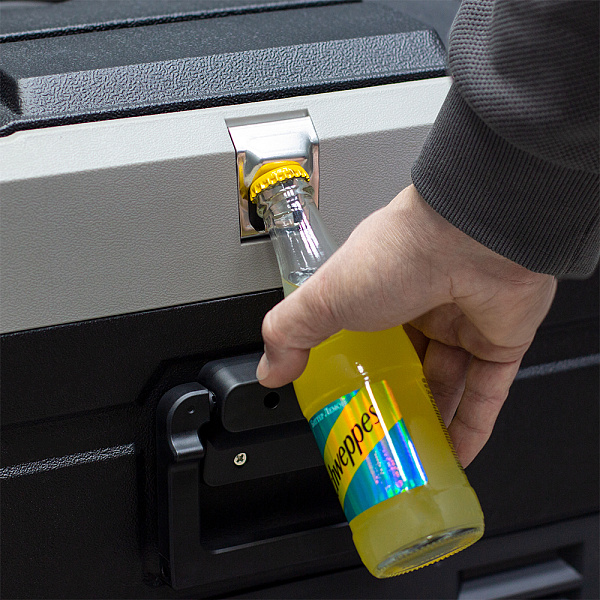 Модель укомплектована многофункциональной дверью-крышкой, дизайн которой даёт возможность использовать её в качестве стола, ставить до четырёх стаканов с напитками в специальные подстаканники. Так же в крышке автохолодильника есть специальные углубления для установки телефонов и планшетов. Любителей рыбалки несомненно порадует наличие на крышке линейки для измерения улова или других трофеев. В качестве бонуса, на корпусе встроена открывалка для бутылок. Благодаря перечисленным особенностям, холодильник идеально подходит для отдыха на природе. Крышка имеет возможность открытия с любой стороны, без специальной перестановки, достаточно освободить резиновые фиксаторы с нужной стороны. Так же её можно полностью снять. Две съёмные корзины позволят быстро загружать и вынимать продукты из холодильника. Боковые ручки обеспечивают лёгкое и удобное перемещение холодильника.