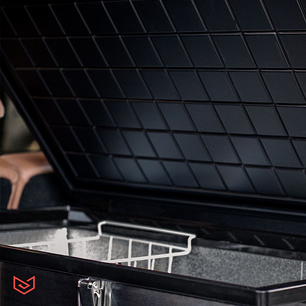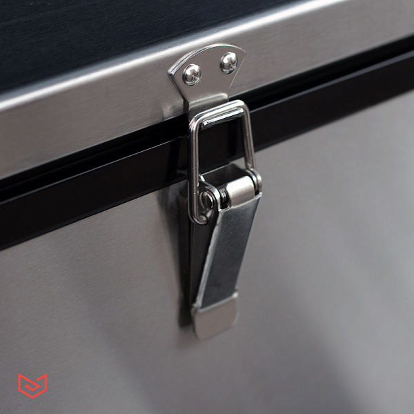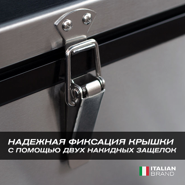 - Надёжная фиксация крышки с помощью двух накидных защёлок, что исключает самопроизвольное открывание при движении;