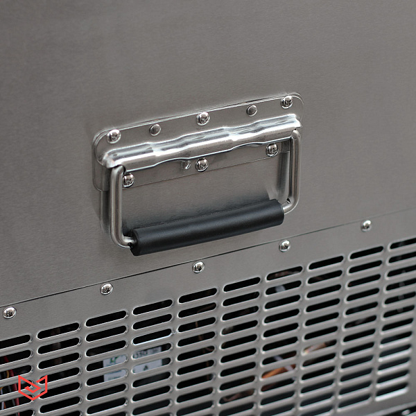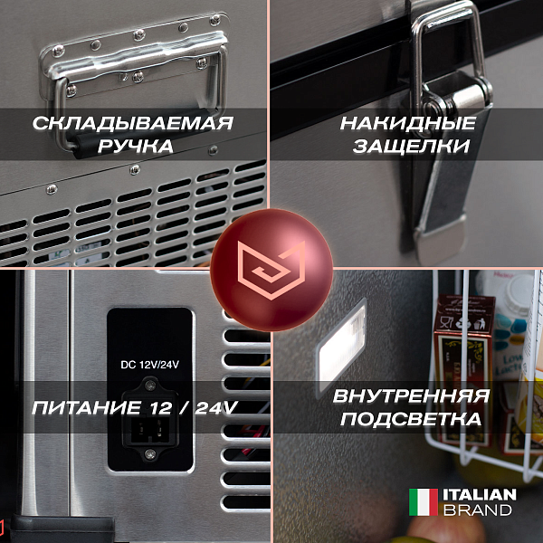 Для удобства ухода за автохолодильником и для защиты испарителя камера заморозки обшита алюминиевыми листами, а корпус изготовлен из нержавеющей стали. Так же, для комфортной транспортировки на корпусе установлены компактные ручки, а для быстрого подключения холодильник укомплектован кабелем для подключения к прикуривателю автомобиля. Благодаря тихому современному компрессору с системой защиты от разгерметизации и с регулируемой скоростью вращения, Вы можете эффективно поддерживать нужную температуру продуктов и напитков в дороге.