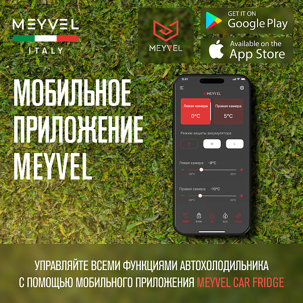 Управление осуществляется с помощью сенсорной панели управления, с функцией блокировки от самопроизвольного срабатывания. Дизайнеры и инженеры Meyvel позаботились о Вашем комфорте и разработали полностью русифицированное мобильное приложение MEYVEL CAR FRIDGE. Скачайте его бесплатно в App Store или Google Play Store и подключитесь к своему автохолодильнику Meyvel. Вы можете управлять устройством всего лишь одним касанием. Включайте и отключайте устройство, меняйте и настраивайте температурный режим прямо в дороге.