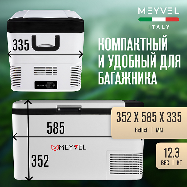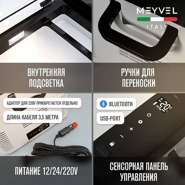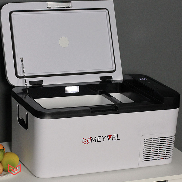 Угол наклона компрессора при работе может составлять до 40 градусов. Экологически чистый хладагент, защищённый испаритель и эффективная изоляция обеспечат безопасную, долгую и надёжную работу автомобильного морозильника. Благодаря использованию качественных комплектующих и высокотехнологичному производству, все холодильники Meyvel обладают высокой эффективностью и надежностью. Технологическая линия и процесс производства сертифицированы согласно международным стандартам.