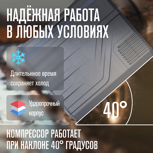 Высокопроизводительный компрессор, работающий от бортовой сети 12/24 В, поддерживает температурный диапазон от +20 до -20 °C. Чтобы быстро заморозить содержимое можно включить режим MAX, при котором аппарат функционирует на максимальной мощности, а функция ECO направлена на экономичный расход энергии.