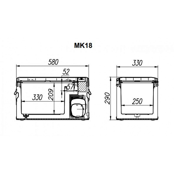 Крышка МК-18 (12/24) – откидная. По бокам модели имеются удобные ручки, облегчающие процесс переноски. При открытии крышки автохолодильника происходит автоматическое включение светодиодной лампы, которая прекрасно освещает обе камеры.
