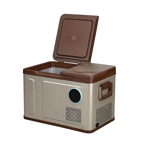 Объем холодильника 38 л, а поддерживаемая температура от +20 до -20°C, что оптимально для хранения продуктов в течение нескольких дней. Внутреннее пространство разделено на две камеры, и в каждой настраивается своя отдельная температура, чтобы одну использовать как морозильник, а вторую — как обычный холодильник. Такая гибкость помогает хранить одновременно и охлажденную, и замороженную еду.