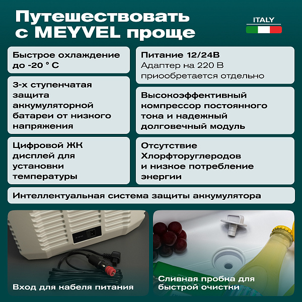Новая модель переносного автомобильного холодильника от итальянского бренда Meyvel идеально подойдет для хранения или перевозки продуктов и напитков. AF-F30 можно использовать в грузовом и легковом транспорте, автодомах, на яхтах и катерах. А вместительное внутреннее пространство предоставит возможность поместить в автохолодильник большой запас продуктов.