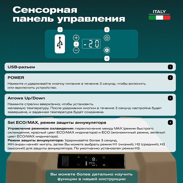 Автохолодильник автоматически поддерживает выбранную температуру от +20 до -20°C. Нужные настройки можно задать с помощью интуитивно понятной панели управления. Она расположена в верхней части корпуса под углом, что исключит случайное нажатие.