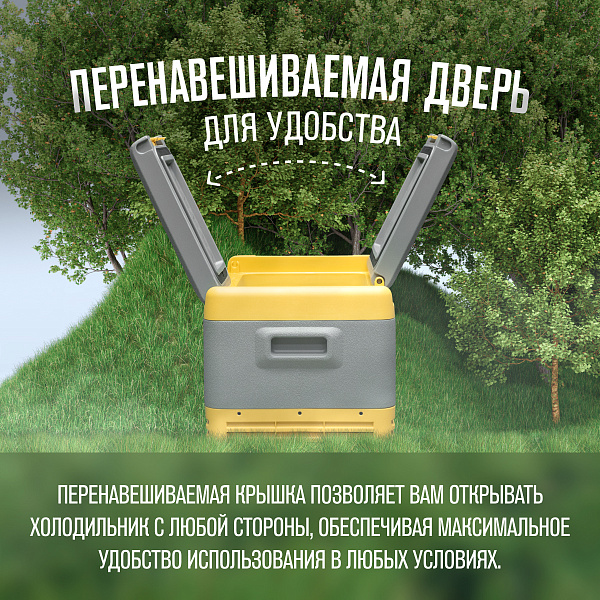 Эта модель подходит для установки не только в легковые автомобили, но и в грузовые, а так же микроавтобусы, катера, автодома и кемперы. Питание осуществляется от прикуривателя (12 или 24 В). Автохолодильник разделён на морозильную и холодильную камеры. Для удобного перемещения автохолодильник оснащён утопленными ручками, такой тип ручек практически не выпирает и не требует лишнего места в Вашем транспортном средстве. Крышки холодильника можно перенавешивать для комфортного варианта открытия. Корпус изготовлен из ударопрочного пластика, который легко переживёт тряску во время езды по внедорожью или случайные удары корпуса