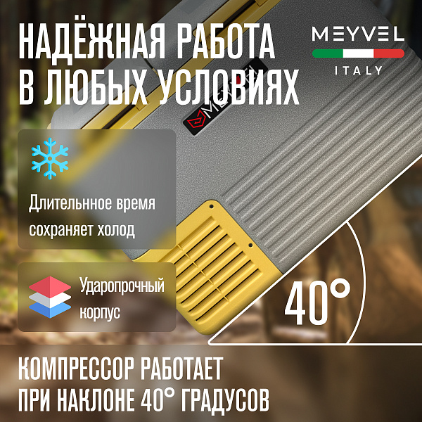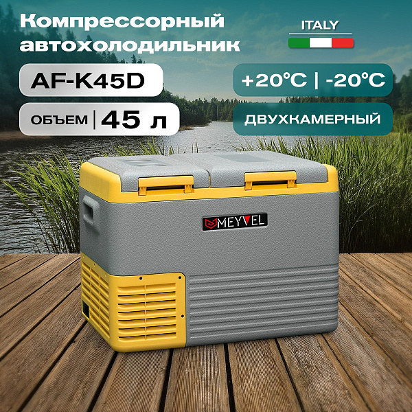 Итальянская компания MEYVEL представляет инновационную модель автомобильного холодильника AF-K45D которая отлично подойдет для транспортировки и хранения любимых продуктов и напитков. В данной линейке есть похожие модели другого объёма: AF-K35D и AF-K55D