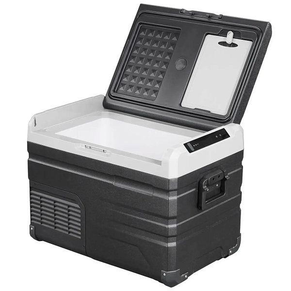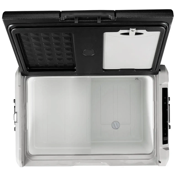 Внутренний объём в 40 литров подходит для длительных поездок: внутрь легко помещаются напитки, свежие продукты, полуфабрикаты и всё необходимое на несколько дней. Стенки гладкие, без лишних выступов — удобно мыть и не скапливается грязь. Для удобной очистки предусмотрена сливная пробка — после разморозки или мойки не нужно переворачивать холодильник: просто откройте заглушку, и вода уйдёт сама.