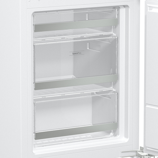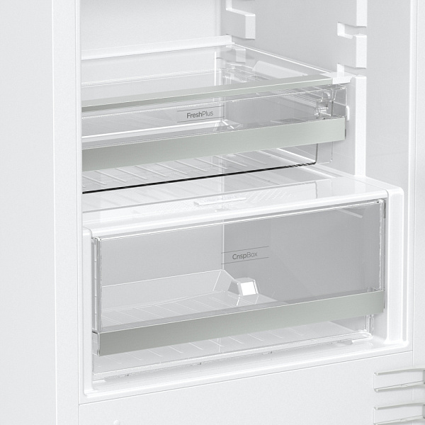 Общий объем составляет 258 литров, из которых 71 литр — морозильная камера. Холодильное отделение оборудовано пятью стеклянными полками с регулировкой по высоте, металлической подвесной полкой для бутылок, зоной свежести с околонулевой температурой и ящиком CrispBox с регулировкой влажности. На дверце — три полки и контейнер для яиц. Морозильная камера включает три прозрачных контейнера, а производительность замораживания составляет 3,5 кг в сутки.