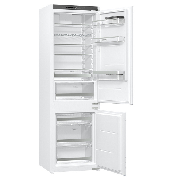 Электронная система управления с сенсорной панелью и дисплеем расположена в верхней части корпуса. Режим суперзамораживания активируется вручную и позволяет быстро подготовить камеру к загрузке большого объема продуктов. В холодильной части используется капельная система размораживания, а динамическое охлаждение способствует равномерному распределению температуры.
