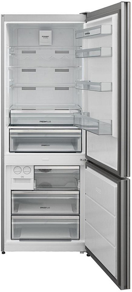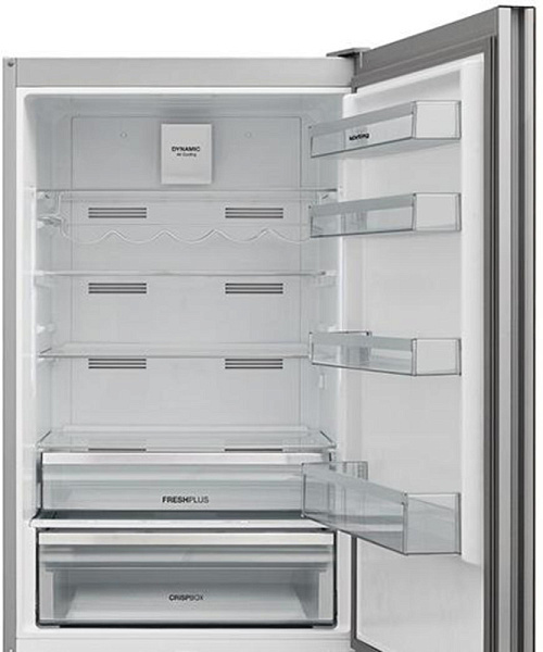 В холодильной камере установлены прочные стеклянные полки, выдерживающие вес тяжёлой посуды. Дверные полки с бортиками надёжно фиксируют бутылки и упаковки. Для хранения овощей, фруктов и зелени предусмотрены два вместительных ящика: один — в зоне свежести, другой — с регулировкой влажности. Зона свежести поддерживает оптимальные условия для хранения мяса, рыбы и других скоропортящихся продуктов, а контроль влажности предотвращает их пересыхание.