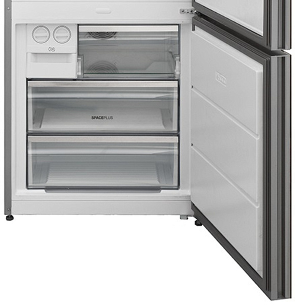 Морозильная камера оснащена тремя ящиками, включая увеличенный объём для крупных упаковок. В верхней части расположен компактный ледогенератор с ёмкостью для льда.