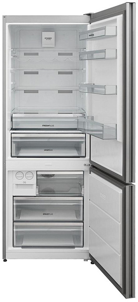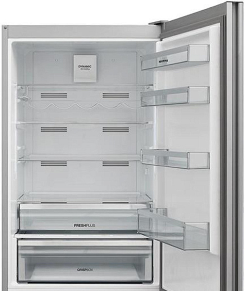 В холодильной камере установлены прочные стеклянные полки, способные выдерживать вес тяжёлой посуды. Дверные полки с высокими бортиками надёжно удерживают бутылки и упаковки при открывании. Для хранения овощей, фруктов и зелени предусмотрены два вместительных ящика: один — в зоне свежести, другой — с регулировкой влажности, что позволяет создавать оптимальные условия для разных типов продуктов.