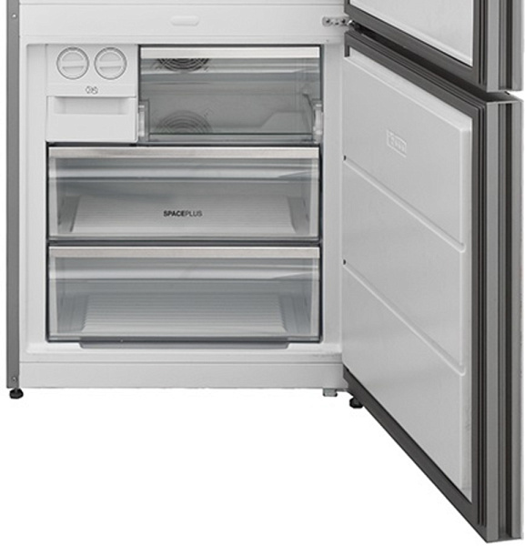 Модель оснащена световой и звуковой индикацией, включая сигнал открытой двери, а также двумя лампами освещения и металлической полкой для бутылок. Морозильная камера включает три ящика, один из которых увеличенного объёма — идеально подходит для хранения крупных упаковок и домашних заготовок. В верхней части расположен компактный ледогенератор, обеспечивающий запас кубиков льда для напитков.