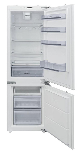 Общий объем составляет 243 литра, из которых 180 литров — холодильная камера и 63 литра — морозильная. Внутри предусмотрены четыре стеклянные полки с регулировкой по высоте, подвесная полка для бутылок и ящик CrispBox с регулировкой влажности для овощей и фруктов. Морозильное отделение включает прозрачные контейнеры и выдвижную полку Sliding Tray, что делает организацию хранения удобной и гибкой.