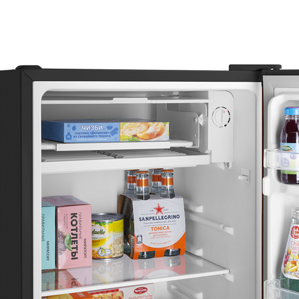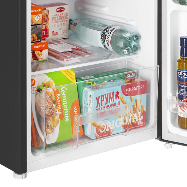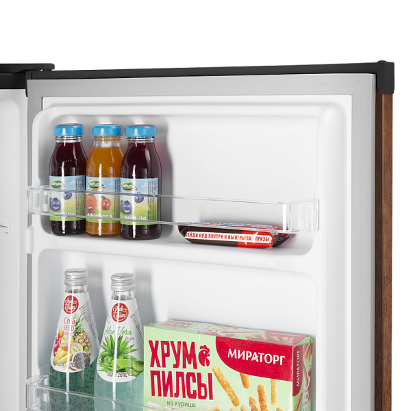 Внутри холодильника предусмотрена небольшая морозильная камера, позволяющая хранить замороженные продукты и готовые блюда. Удобные полки из прочного стекла и вместительные дверные отделения обеспечивают удобство и рациональность размещения продуктов, что особенно важно при ограниченном пространстве.