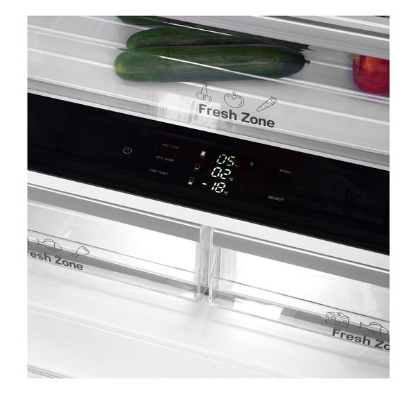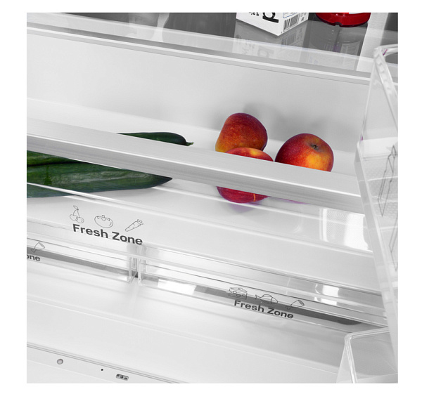 Зона свежести создаёт все условия, чтобы содержимое холодильника как можно дольше оставалось свежим. В зоне для хранения мяса и рыбы с регулируемой температурой от -1 °C до +5 °C продукты остаются свежими в 3 раза дольше, а фрукты, овощи и зелень – даже в 5 раз дольше благодаря контролю уровня влажности.