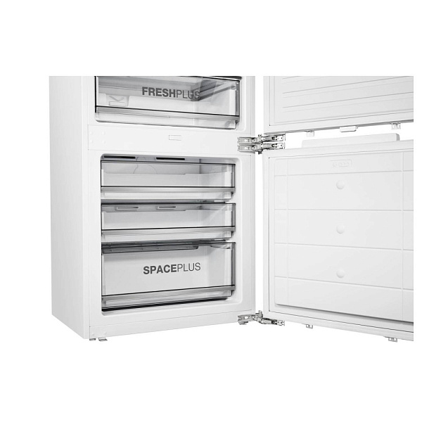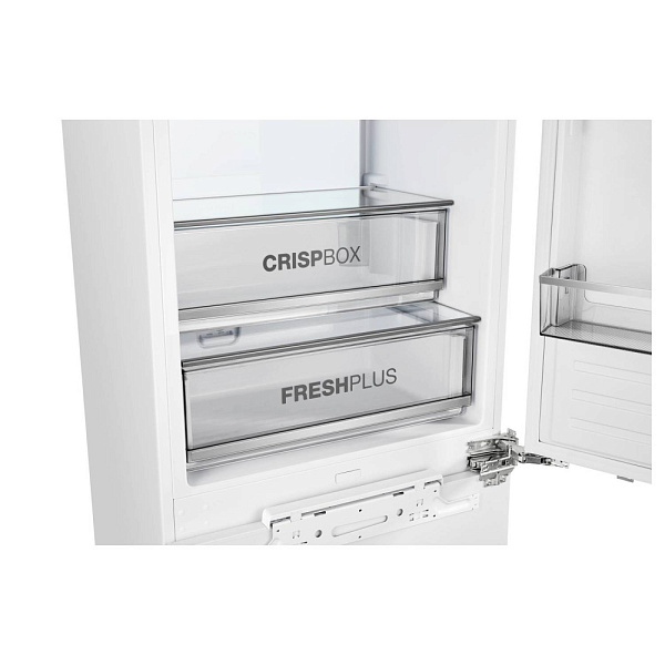 Холодильник оснащён отдельной зоной свежести с возможностью индивидуальной настройки температуры и уровня влажности. Это позволяет дольше сохранять вкус и питательные свойства продуктов, особенно овощей, фруктов и зелени. Морозильное отделение включает увеличенный ящик, идеально подходящий для хранения крупных упаковок и запасов замороженных продуктов.