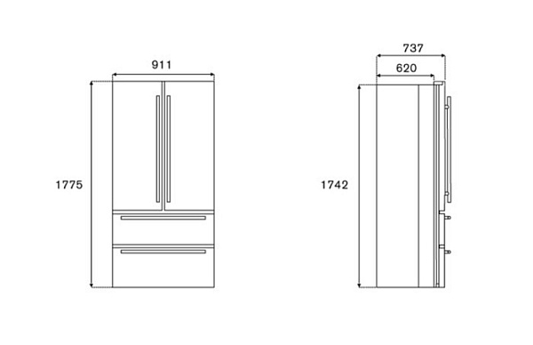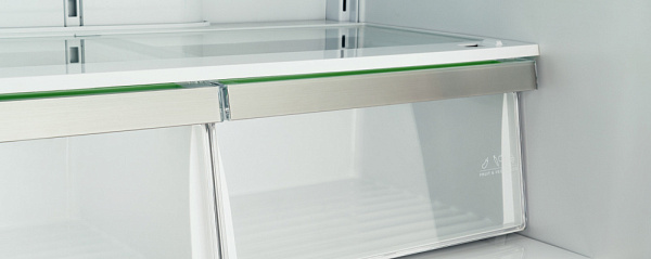 Двойная система воздушного охлаждения для отдельных холодильного и морозильного отделений обеспечивает оптимальный контроль температуры и влажности для наилучшего сохранения продуктов. Два выдвижных ящика морозильной камеры обеспечивают удобный доступ, а в верхнем отделении находится лоток для автоматического приготовления льда. Внутренняя конфигурация холодильного отделения обеспечивает максимальную гибкость благодаря полкам, из которых 1 фиксированная и 4 с регулировкой по высоте, а также широкому отделению для хранения в дверце.