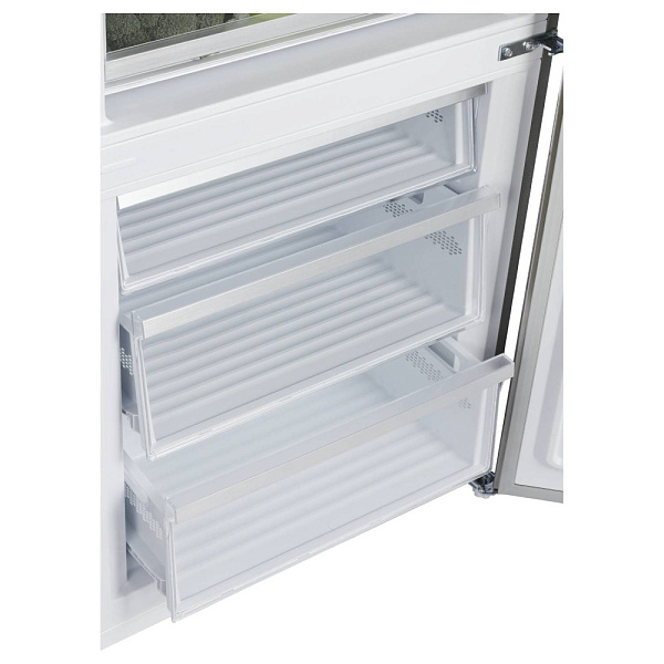 В холодильной части предусмотрены три стеклянные полки, два больших ящика для овощей и фруктов, четыре дверные полки и подставка для яиц. Морозильная камера включает три ящика и лоток для приготовления льда. Такое распределение пространства делает хранение удобным и организованным.