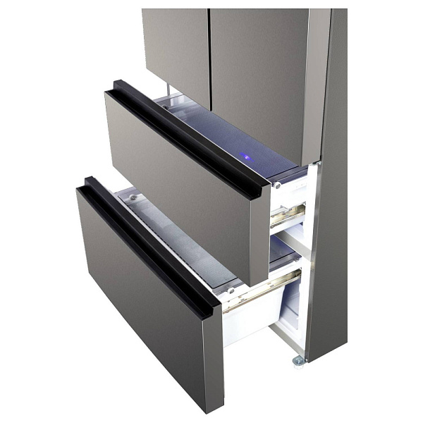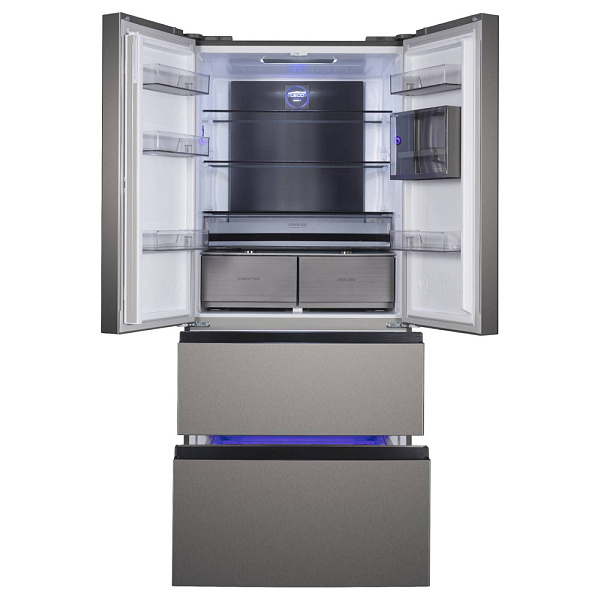 Модель оснащена тремя камерами, включая специальную зону свежести, предназначенную для хранения овощей, фруктов и зелени. В этой зоне поддерживается околонулевая температура, благодаря чему продукты сохраняют свою текстуру и не пересыхают. Динамическая система охлаждения равномерно распределяет холодный воздух, поддерживая стабильный микроклимат.
