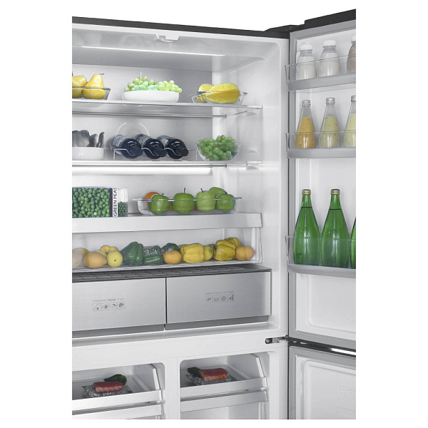 Внутри предусмотрена зона свежести, где поддерживается околонулевая температура — идеальные условия для хранения овощей, фруктов и зелени. Динамическая система охлаждения равномерно распределяет холодный воздух, предотвращая пересыхание и перемораживание продуктов.