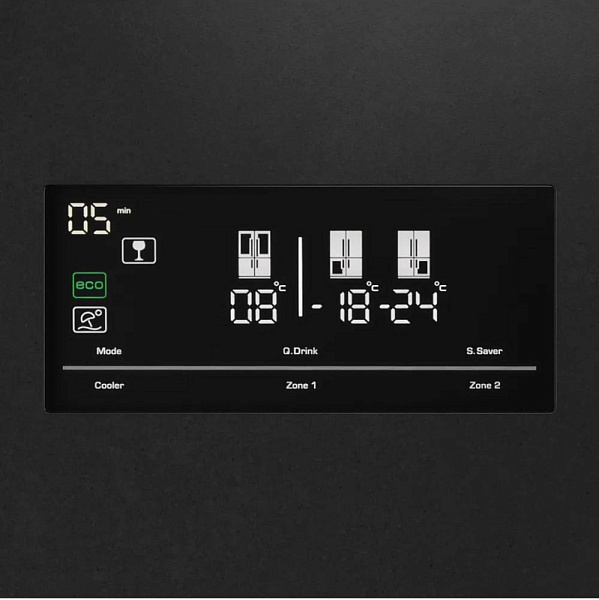Основные габариты составляют 185×91×78 см, что позволяет вместить в него достаточное количество продуктов. Общий объем прибора равен 560 литрам, из которых 390 литров отводится под холодильную камеру, а 170 литров под морозильную. Морозильная камера расположена снизу и имеет четырехзвездочное обозначение, что гарантирует эффективное замораживание продуктов. Управление осуществляется с помощью электронной системы и сенсорных кнопок. На дверце прибора расположен цифровой дисплей, который позволяет контролировать и регулировать температуру внутри камер. Для удобства использования предусмотрена система No Frost, которая предотвращает образование инея и снега внутри камер.