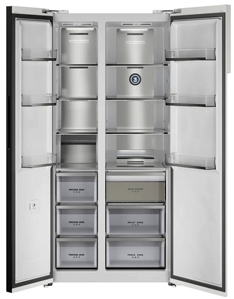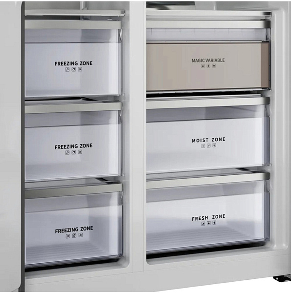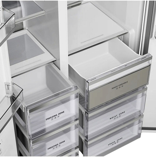 Уникальность в расположении морозильной камеры — Side-by-Side. Это означает, что морозильная и холодильная камеры расположены рядом, что обеспечивает легкий доступ к обоим камерам. Объем холодильной камеры составляет 294 литра, а морозильной — 308 литров, что позволяет хранить большое количество продуктов.