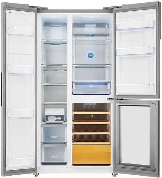 Оснащенный тремя камерами, он предлагает общий объем в 535 литров. Холодильная камера вмещает 207 литров, морозильная — 184 литра, и дополнительная зона свежести занимает еще 17 литров. Отдельно выделена винная камера, которая вмещает 127 литров, что позволяет хранить до 16 бутылок вина в оптимальных условиях.