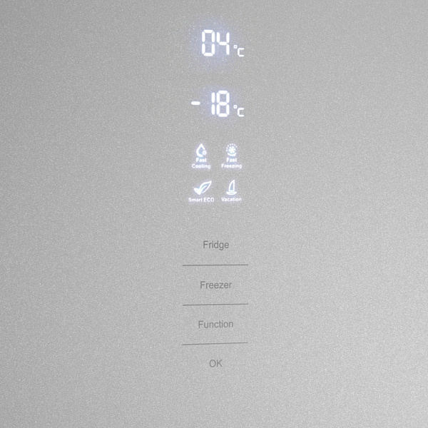 Управление холодильником интуитивно понятное: электронная панель с сенсорными кнопками позволяет легко выбирать режимы работы, включая быструю заморозку и энергосбережение. Это делает использование прибора максимально удобным и практичным.
