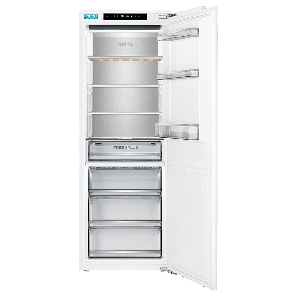 Холодильник оснащён электронной системой управления с сенсорной панелью и дисплеем, что позволяет точно контролировать температуру. Динамическое охлаждение с вентилятором обеспечивает равномерное распределение холода по всей камере, предотвращая перепады температуры и смешивание запахов. Функция суперохлаждения пригодится после похода в магазин — она быстро снижает температуру, чтобы продукты быстрее охладились и дольше сохраняли свежесть.