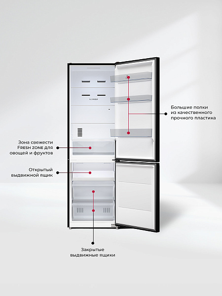 Два отделения с полезным объемом 456 литров дают возможность хранить все блюда и напитки на удобном уровне. Внутреннее пространство холодильника организовано максимально эффективно благодаря регулируемым полкам.