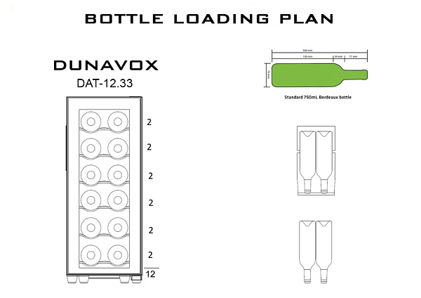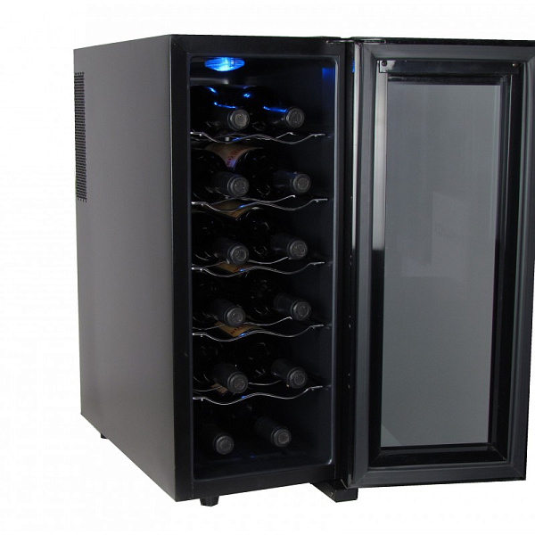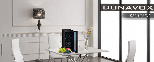 Небольшой и вместительный термоэлектрический винный шкаф DAT-12.33C для дома вмещает в себя 12 бутылок и имеет одну зону охлаждения. Винный шкаф предназначен для установки на столешницу или стол. Встраивать его нельзя, так как термоэлектрические элементы чувствительны к перегреву и установка его в нишу крайне нежелательна, также не рекомендуется размещать винный шкаф на подоконнике, где он будет подвергаться воздействию солнечных лучей.