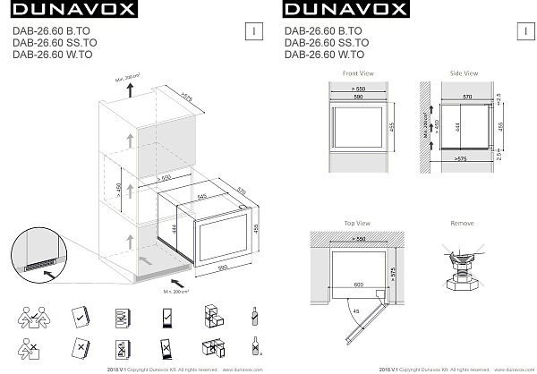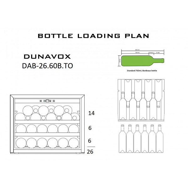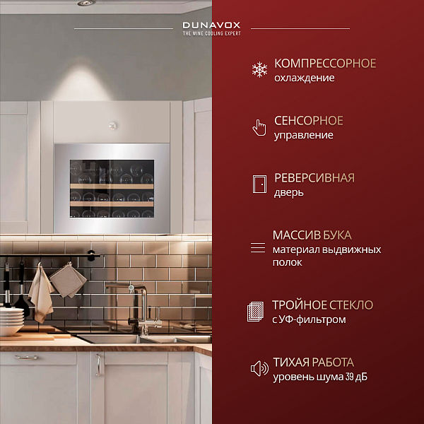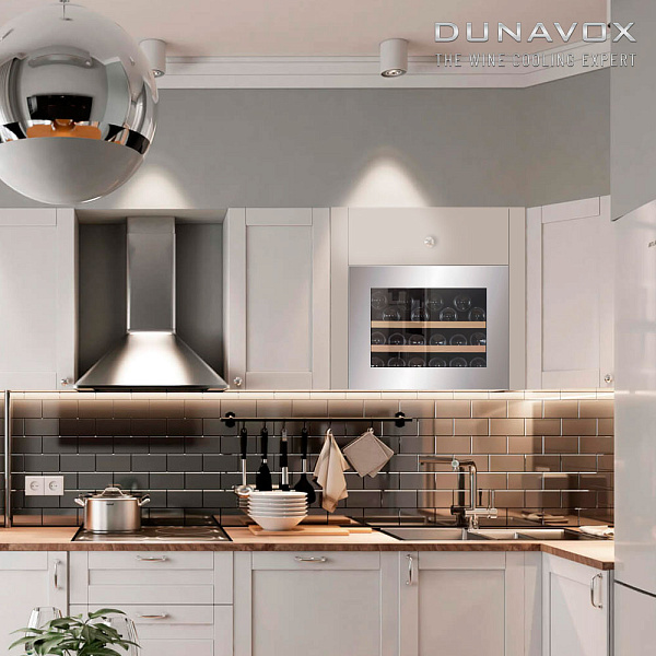 Винный шкаф Dunavox DAB-26.60SS.TO предназначен для встраивания в нишу. Для обеспечения отвода горячего воздуха необходимо предусмотреть сквозную вентиляционную нишу площадью не менее 200 см² от цоколя до верхней части мебельного модуля.