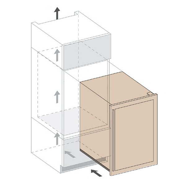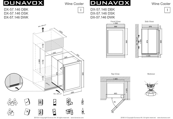 Винный шкаф Dunavox DX-57.146DSK предназначен для встраивания в нишу. Для обеспечения охлаждения компрессора и отвода горячего воздуха необходимо предусмотреть сквозную вентиляционную нишу площадью не менее 200 см² от цоколя до верхней части мебельного модуля (см. рисунок).
