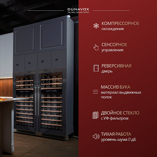 Все самые важные элементы собраны вместе — азбука хранения вин. Приобретая винный шкаф Dunavox DX-74.230DB, вы делаете шаг в новый, профессиональный мир хранения вин. Ведь все знают, что вино — это отражение души. Храните вина правильно вместе с Dunavox!