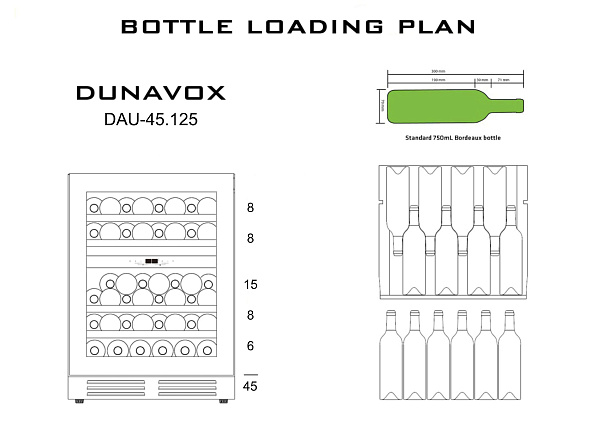 Элегантный винный шкаф Dunavox DAU-45.125DSS.TO - новинка в ряду продукции от производителя Dunavox. Данная модель работает на базе малошумного компрессора, за счет чего обеспечивает Вам надежную защиту от посторонних шумов. Внутреннее пространство Dunavox DAU-45.125DSS.TO способно вместить до 45 бутылок типа Бордо, объем каждой из которых не будет превышать 0, 75 л.