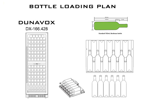 Рекомендуется устанавливать винный шкаф Dunavox DX-166.428DBK вдали от прямых солнечных лучей и источников тепла (духовки, нагревателя, батареи и т.д.). Прямой солнечный свет может плохо повлиять на корпус, а источники тепла могут увеличить энергопотребление. Не допускается установка аппарата рядом с плитой или прибором, который может нагревать воздух в пространстве 1-5 см от его корпуса (например, рядом схолодильником, у которого теплообменная стенка граничит с аппаратом). Не рекомендуется устанавливать прибор на полы с подогревом без специальной термоизолирующей подложки.