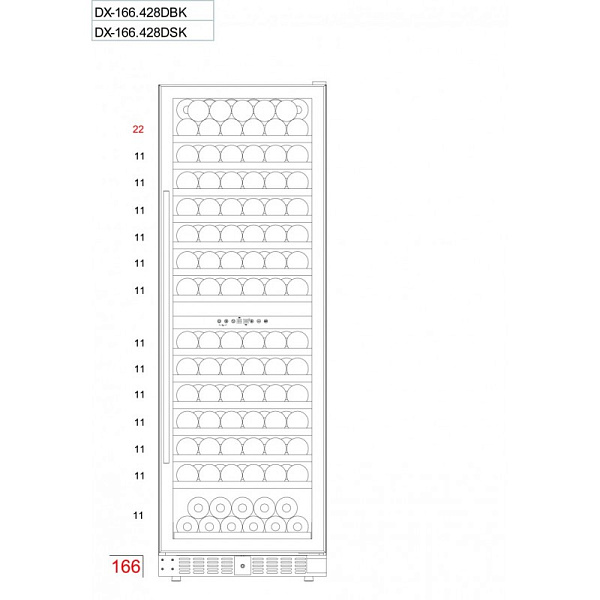 Компрессорный винный шкаф DX-166.428DBK может быть встроен в мебельную нишу с соблюдением необходимых для охлаждения зазоров 2-5 см или использоваться как отдельностоящий. Охлаждение системы компрессора организовано через вентиляционные решетки внизу шкафа.