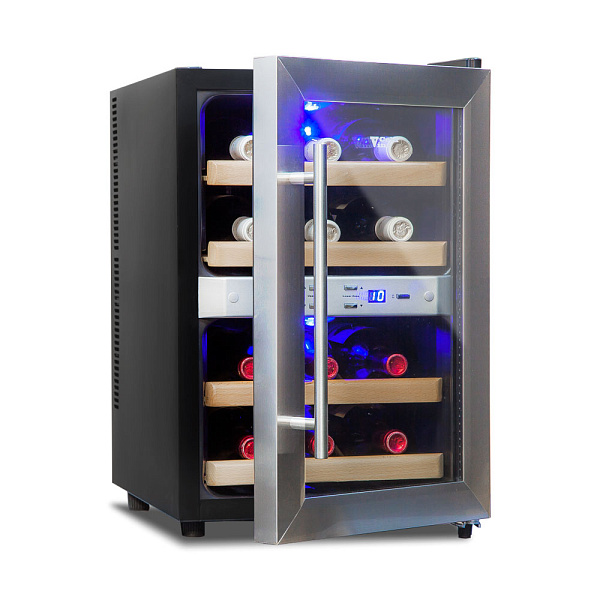 В каждой из зон можно установить температуру в диапазоне от +7 до +18˚С, поэтому в шкафе можно хранить несколько видов вина одновременно. Вместимость винного холодильника составляет 12 бутылок типа Бордо емкостью 0,75 л.