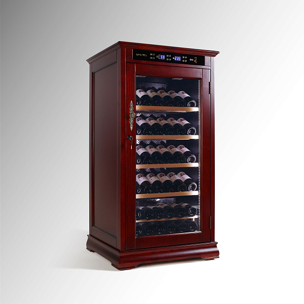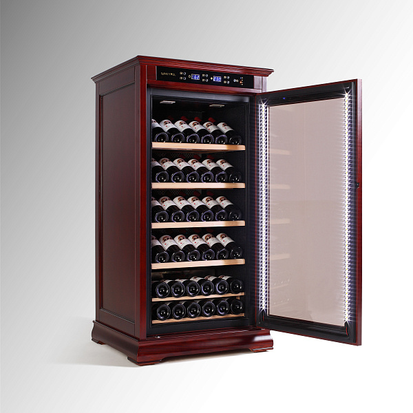 Благодаря специальному алюминиевому покрытию с тиснением внутри корпуса данной модели, достигается оптимальный показатель циркуляции воздуха и равномерного охлаждения содержимого. Для максимального удобства пользователя, производитель установил интуитивно понятную систему управления в верхней части винного шкафа, с помощью которой Вы можете настроить необходимый температурный режим, а также скорректировать показатели уровня влажности.