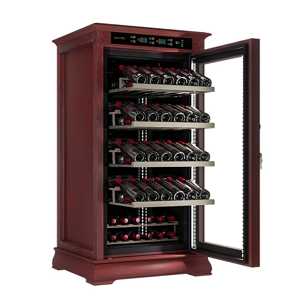 Благодаря изысканному внешнему виду, данный винный шкаф становится оптимальным вариантом для установки в классическом интерьере: деревянный короб, выполненный из Американского красного дуба отлично дополнит любое дизайнерское решение. Одним из отличий модели MV66-WM1-C от других винных шкафов данной линейки является расширенная вместимость: внутреннее пространство рассчитано на хранение до 66 бутылок типа Бордо (объем - 0, 75л). При заданных габаритах и достаточно обширном объеме внутреннего пространства, данную модель вполне можно отнести к группе компактных винных шкафов, оптимально подходящих для установки в любой функциональной зоне.