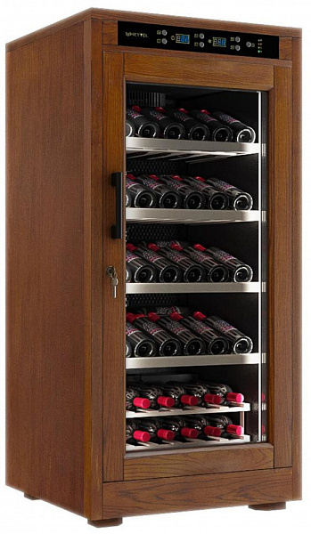 Одна камера в технике такого типа встречается чаще всего, потому что в ней просто расположить все функциональные детали, и в итоге прибор действительно похож на обычный шкаф. Охлажденный воздух поступает внутрь благодаря компрессору. Размораживается автоматически, поэтому не нужно вручную удалять иней со стенок и поддерживать тем самым оптимальные условия. Общий диапазон температур, которые можно установить: 5-22 градусов. Средняя влажность воздуха (в процентах), которая поддерживается, чтобы пробки в бутылках не пересыхали: 56-78.