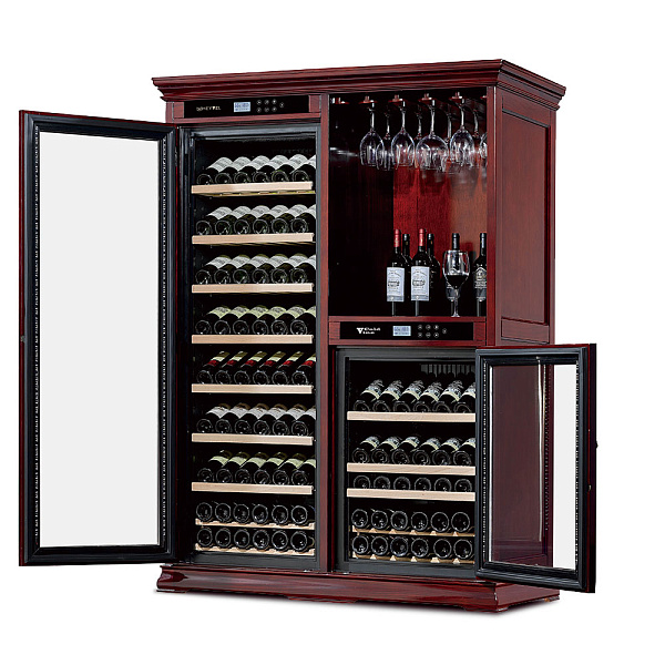 Корпус модели MV154-WM2-BAR-C выполнен из американского красного дуба, отличающегося высокой износостойкостью. Преимущество данного бара заключается в его расширенной вместительности: две независимые температурные зоны хранения вина подразумевают размещение до 232 бутылок вина типа Бордо (0,75 л), специальная сервировочная зона позволит Вам осуществить грамотное хранение всех необходимых винных аксессуаров, а держатели для винных бокалов добавят модели изящный вид. Винный бар MV154-WM2-BAR-C станет идеальным вариантом для установки в классическом дизайне интерьера – модель оптимальна как для ресторана, так и для личного пользования.