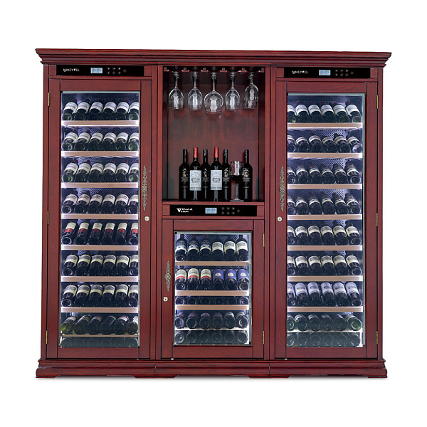 Изысканный дизайн винного бара MV262-WM3-BAR-C является отличительной чертой данной линейки деревянных винных шкафов: корпус, выполненный из американского красного дуба, три независимые температурные зоны, сервировочная зона с местом для хранения необходимого винного инвентаря и аккуратные винные держатели – всё это характеризует данный бар не только как максимально эстетичный, но и не менее многофункциональный. Внутреннее пространство рассчитано на хранение до 392 бутылок вина типа Бордо (0, 75 л) – данный показатель делает модель самой вместительной среди представленной линейки. Объемная вместительность и изысканный внешний вид делают данную модель оптимальной для размещения в ресторанах, выполненных в классическом стиле.