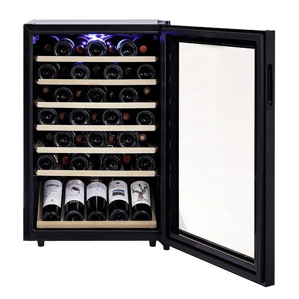 Лаконичный дизайн шкафа придаёт интерьеру современный вид. Дополнительно у данной модели предусмотрен демонстрационный режим, во время которого освещение не гаснет. Такая функция помогает демонстрировать винную коллекцию Вашим друзьям и близким. Используется освещение синего цвета, которое обеспечивает равномерную подсветку всех полок.