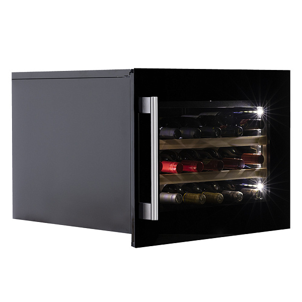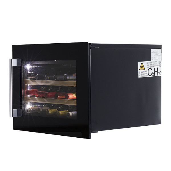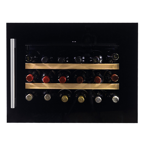 Лаконичный дизайн шкафа придаёт интерьеру современный вид. Чёрный корпус и рамка добавляют элегантности и солидности. В этой модели использовано панорамное освещение синего, янтарного и белого цвета, которое обеспечивает равномерную подсветку всех полок. (Освещение плавно включается при открывании дверцы, а через пару секунд после закрытия плавно гаснет.) Дополнительно у данной модели шкафа предусмотрен демонстрационный режим, во время которого освещение не гаснет. Такая функция помогает демонстрировать винную коллекцию Вашим друзьям и близким.
