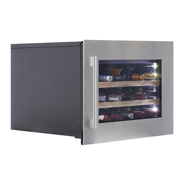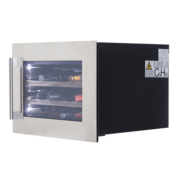 Лаконичный дизайн шкафа придаёт интерьеру современный вид. Чёрный корпус и рамка из бесшовной нержавеющей стали добавляют элегантности и солидности. В этой модели использовано панорамное освещение синего, янтарного и белого цвета, которое обеспечивает равномерную подсветку всех полок. (Освещение плавно включается при открывании дверцы, а через пару секунд после закрытия плавно гаснет.) Дополнительно у данной модели шкафа предусмотрен демонстрационный режим, во время которого освещение не гаснет. Такая функция помогает демонстрировать винную коллекцию Вашим друзьям и близким.