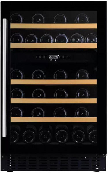 В прибор помещаются 38 бутылок типа бордо, благодаря наличию двух температурных зон вы можете хранить различные сорта вин в верхней части и нижней. Градусы выставляются с помощью сенсорных кнопок и высвечиваются на дисплее.